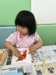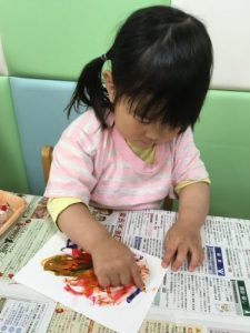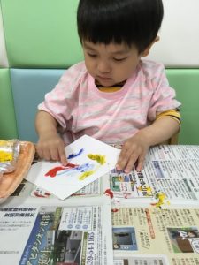 指にたっぷり絵の具をのせたあとは、ぱったんと半分に折ってデカルコマニーを楽しみました![]()