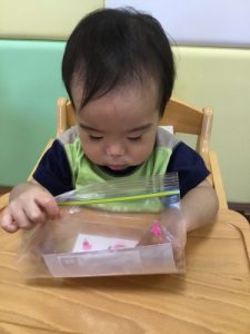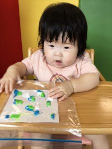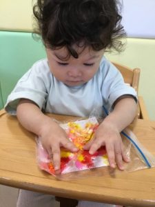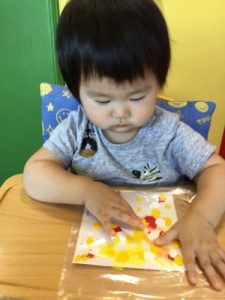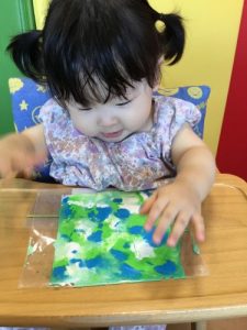 画用紙に絵の具を載せた後ジップロックの中に入れ、袋の上から手でお絵描き![]()