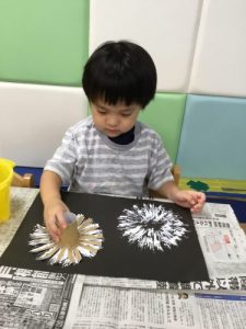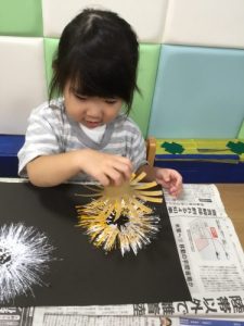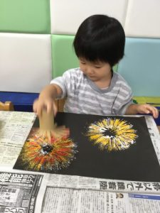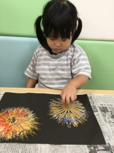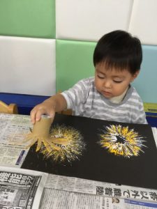 トイレットペーパーの芯をタコの足のように切って、絵の具をつけて花火を描きました✨