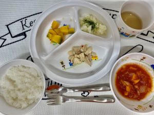 お誕生日会でいつもとは違ったミネストローネが出ましたが、子ども達はトマトで口周りを真っ赤にしていっぱい食べてくれました♪