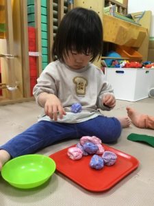 小さなお手玉をお皿に乗せて…