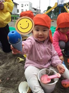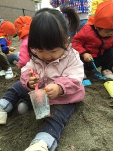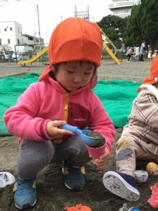 公園では、カップに砂を入れたり、