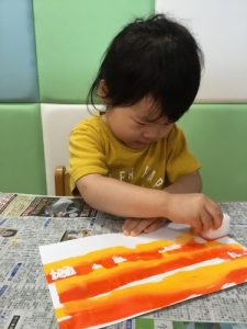 ジップロックに画用紙を入れ、その上に絵の具を付けて手で伸ばしていき模様を付けました🎶