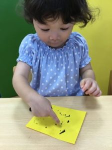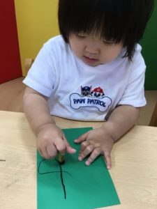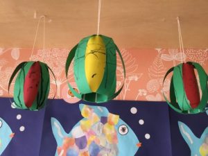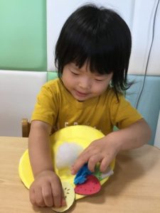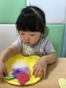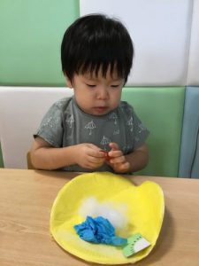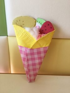 紙皿に、アイスに見立てたお花紙や、クリームに見立てた綿、バナナやイチゴなどのフルーツを貼っていきました🍓