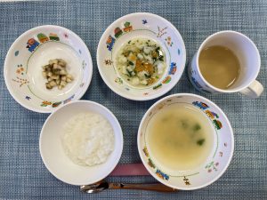 (写真は離乳食後期です。年齢によって形、固さ、盛り付け量を変えて提供しています)