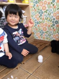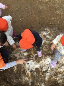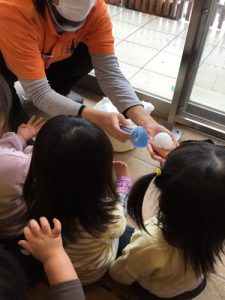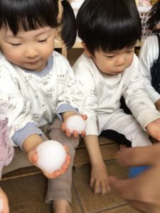 まずは園の玄関で…アイスの形をした雪を渡して見ると…