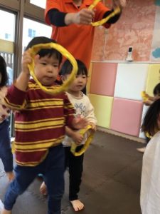 リトミックではハンドルを持って「はたらくくるま」をしました🚓
