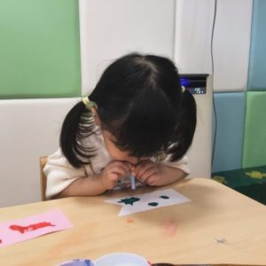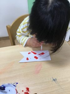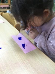 りんご組は紙に垂らした絵の具にストローで息を吹きかけて動かしてみました🌬