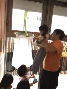 子ども達は少し高い玉入れでも全身を使ってボールを投げて楽しんでいました。