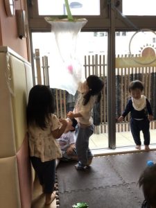 シャボン玉🫧も人気で、保育士が、シャボン玉を飛ばすと追いかけたりして楽しんでいました。