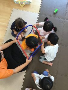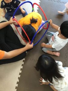 玉入れの後は、フラフープで作ったトンネルで遊びました。