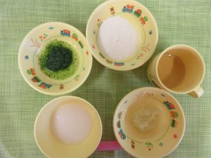 (写真は離乳食後期です。年齢によって形、固さ、盛り付け量を変えて、提供しています。)