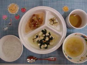 (写真は普通食になります。年齢によって盛り付け量を変えて、提供しています。)
