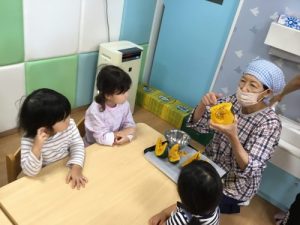 調理の先生のかぼちゃのお話、しっかり聞けていますね❤️