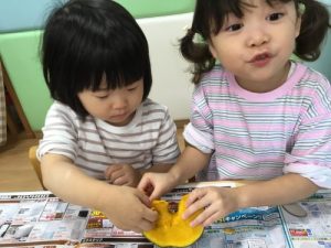 積極的にかぼちゃに触り感触を確かめる2歳児さん✨