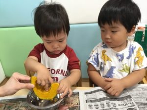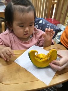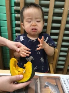 0歳児さんも普段見ることのない調理前のかぼちゃに興味津々でした❤️