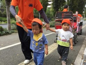 今まではカートでの移動がメインだった1歳児さん達ですが秋からは歩いてのお散歩に挑戦✨
