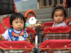 カートの中から怪訝な顔を向けてくる0歳児さん達…