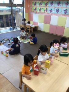 電車遊びにお絵描き、ぽっとん落としとそれぞれやりたい遊びができて楽しそうな子ども達です☺️