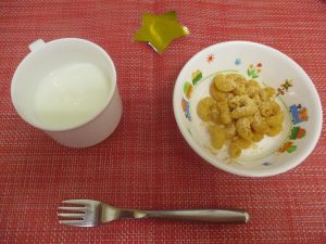 (写真は離乳食後期です。年齢によって形、固さ、盛り付け量を変えて、提供しています。)