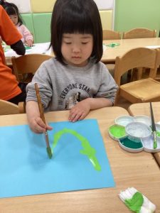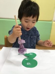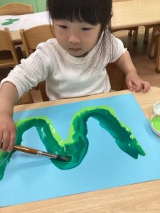 2歳児さんは筆を使って蛇を描いてもらいました🖌️