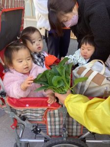 0歳児さん達にも収穫した野菜を見せてあげると興味津々で手を伸ばす様子が❤️