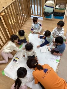 お部屋の中では大きな紙にみんなでお絵描き✒️
