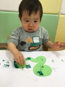 1歳児さんはスポンジやタンポを使って蛇に模様をつけました✨
