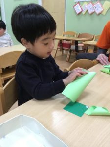 緑と黄緑の2色の紙を使って凧を作りました✨