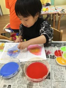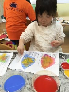 着物用の紙を色水につけると染まっていく様子に興味津々でした☺️