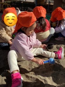 いちご組のお友達は丸いスコップを使ってアイスクリーム🍨を作っているお友達もいました。