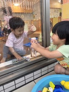 お部屋の中にいる子と窓ガラス越しに水遊び⁉️