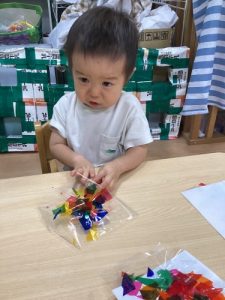 2歳児さんは細かく切ったカラーセロファンをテープで作ったシートにペタペタ❗