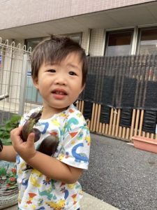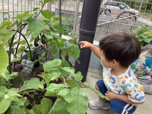 そして保育園の前で育てているナスの収穫をお手伝いしてもらいました❗