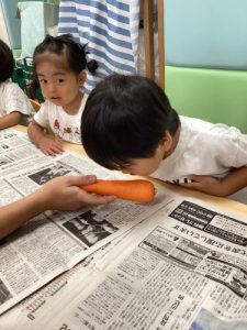 絵本などには出てきますが調理されていないニンジンに触れる機会はあまりないので、みんな興味津々でニンジンに触っていました✨