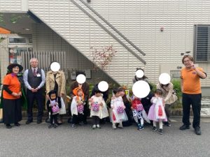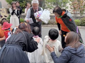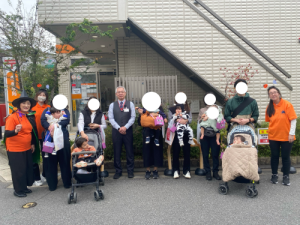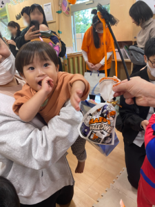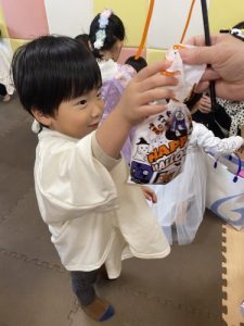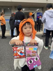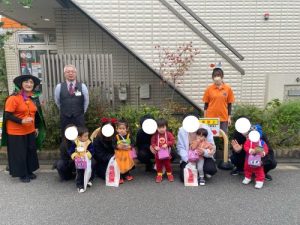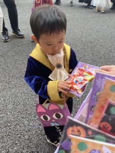 地域の方にご協力頂きお菓子🍭を貰うと緊張しながらもみんなで「トリック・オア・トリート」と言いお菓子をもらいました。