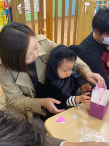 その後お菓子を貰いに行く前に親子でお菓子を入れる鞄作りをしました。