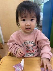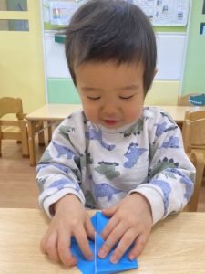 「私も上手に出来るのよ💗見ててね」折り紙ビリビリ上手に出来ました🎶