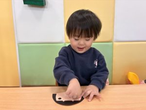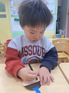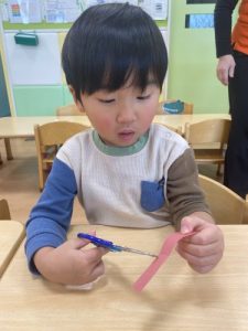 「まずははさみで紙をちょきちょき!」上手にはさみを持っていますね✂️