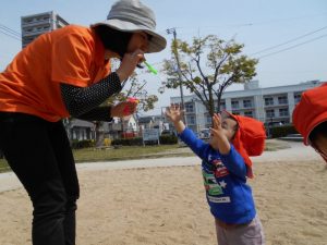 しゃぼん玉に触ろうと両手いっぱい広げて追いかける子どもたち![]()