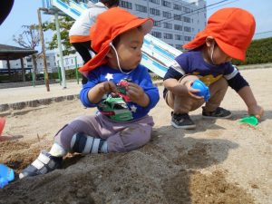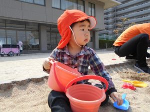 スコップで砂をすくったり、カップに入れたりと砂の感触を楽しんでいました。