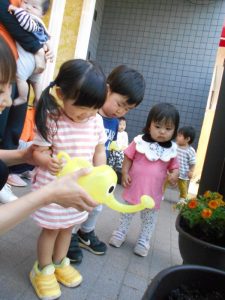 ジョウロに興味津々です!!水やりの順番が待ちきれない様子でした