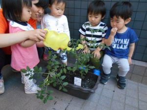みんなでトマトやお花の成長を感じたり、水やりすることが