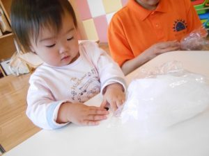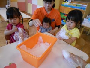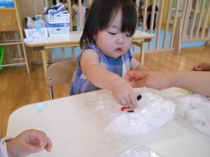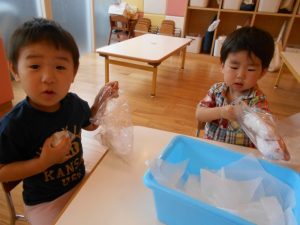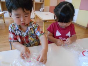 みんなで丸めた花紙をビニールにつめて、てるてるぼうずの頭を作ります![]()