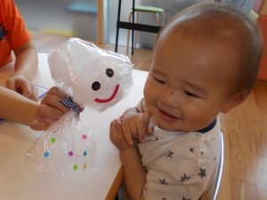「さぁ~てるてるぼうずさんの目と口はどこかな~??」