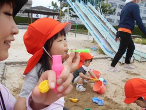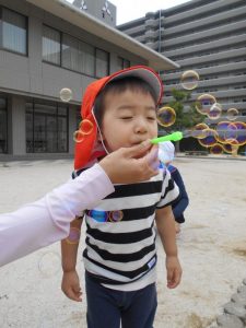 いちご組さんはりんご組さんが吹いたシャボン玉を追いかけてとっても楽しそうでした