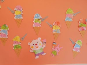 (みんながお絵描きした絵を保育士がチョキチョキと切って…アイスクリーム型に変身!!)