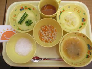 粥 味噌汁 炒り豆腐 スティックきゅうり ゆでポテト