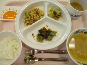 粥 味噌汁 さんまのカレー焼き ビーフン炒め さつま芋の甘煮