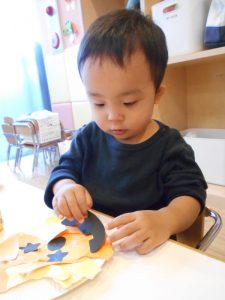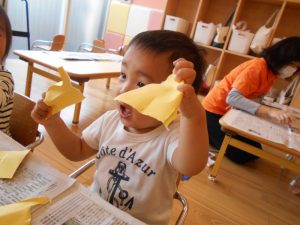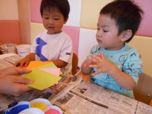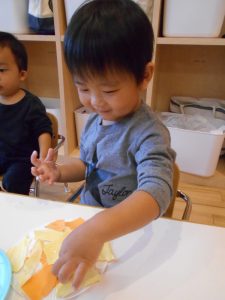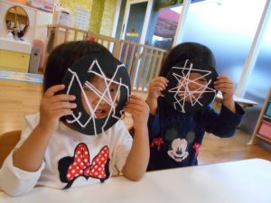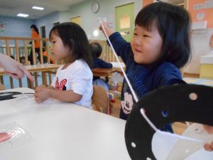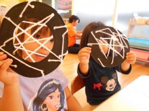 紙皿と糸を見て『なにをつくるのかな⁇』と不思議そうに見ていましたが